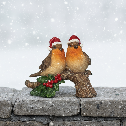 Two Christmas Robins on branch w/holly 13x7x10cm