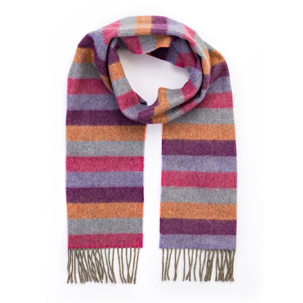 Irish Wool Scarf Long Purple Orange Pink Stripe Herringbone. These 100% lambswool Scarf offer an ideal blend of checks, plaids and stripes for men and women. 100% Lambswool.