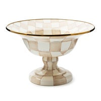An indispensable party serving dish, the Mocha Check Large Compote is decorated with hand-painted, coffee-colored checks. It has a steel underbody and bronzed stainless-steel rim.