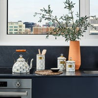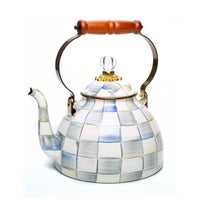 Brimming with signature MacKenzie-Childs charm, our Sterling Check Enamel 3 Quart Tea Kettle is the perfect way to add warmth and style to your kitchen. Hand-painted in rich coffee-coloured checks and finished with a clear glass knob, this stovetop kettle is as beautiful on display as it is functional.